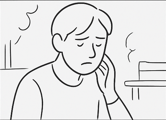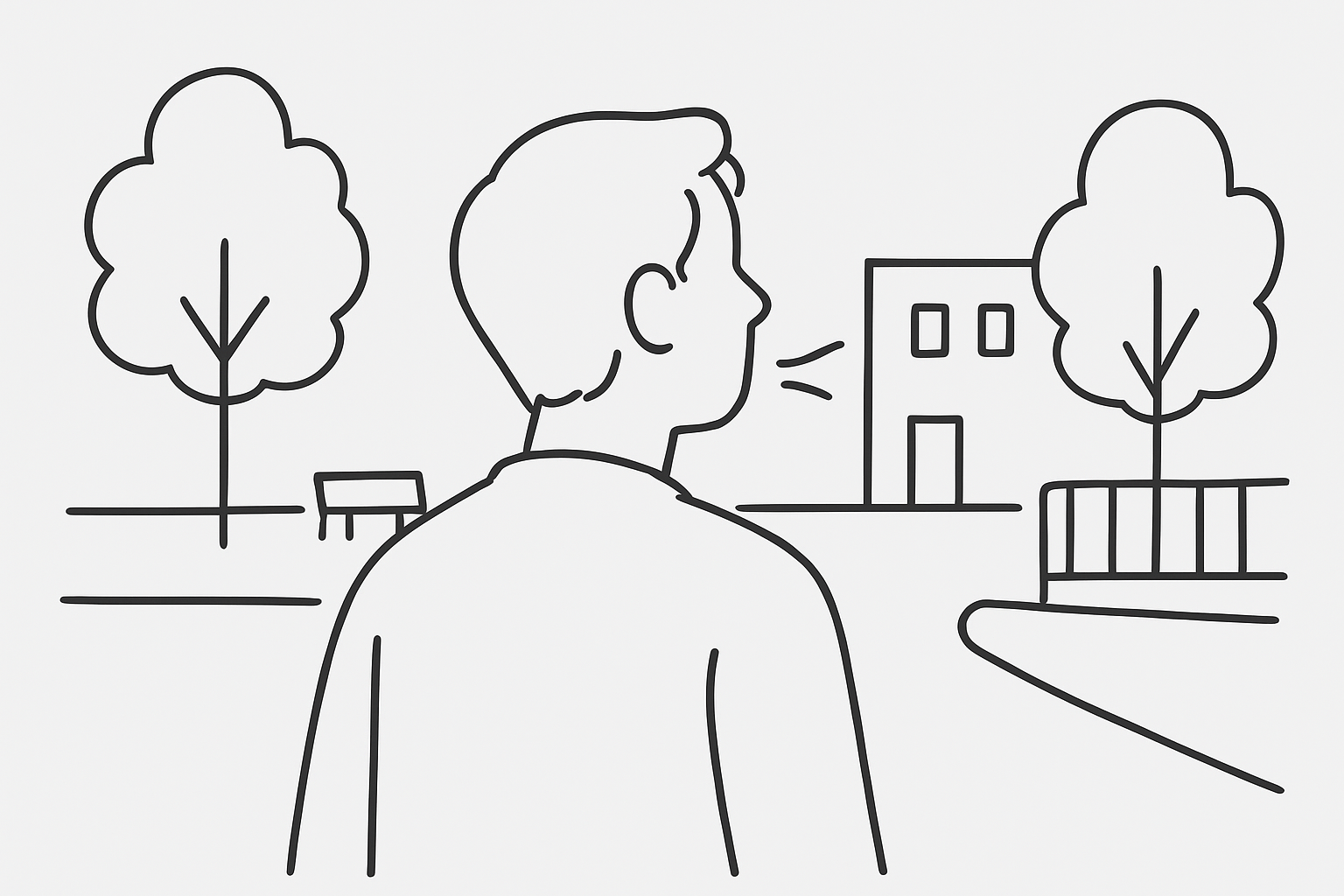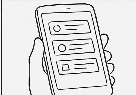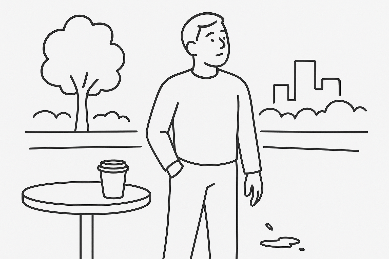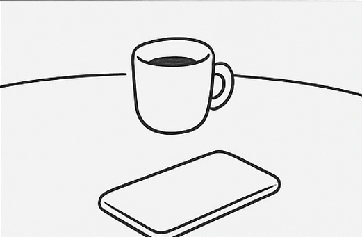 En person sitter med en kopp kaffe og scroller på mobilen. Kameraet fokuserer på skjermen – nyheter, meldinger, stress. Personen sukker. Personen legger mobilen fra seg, tar et langt pust, ser seg rundt og smiler. De legger så mobilen i lomma, ser opp og går videre med ro. Personen skal være til stedet og ikke fokusere på mobilen og dårlige nyheter.