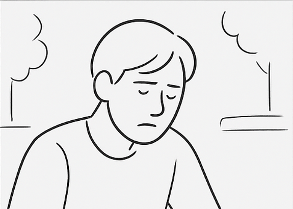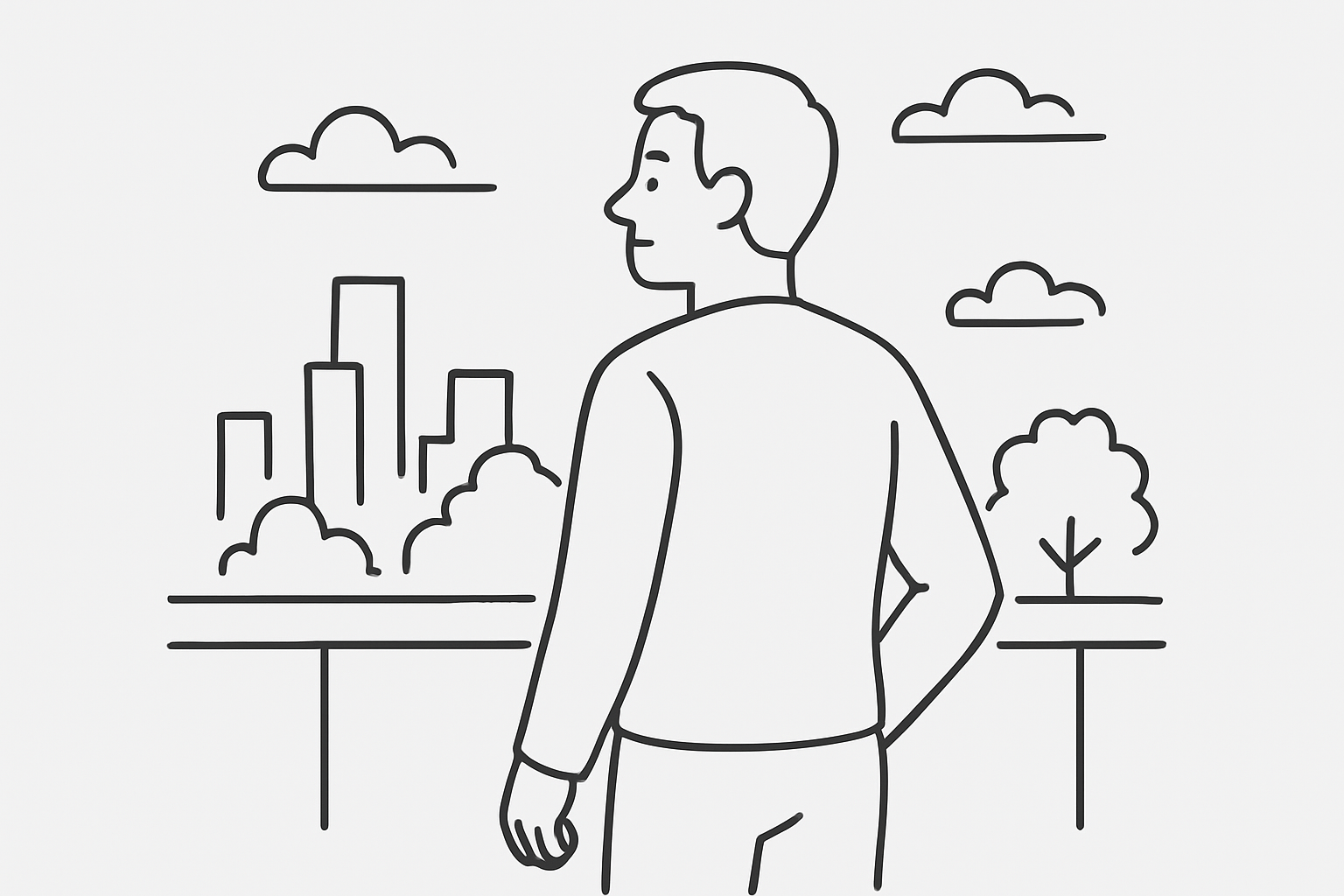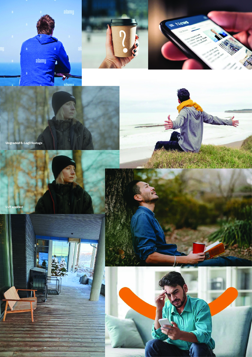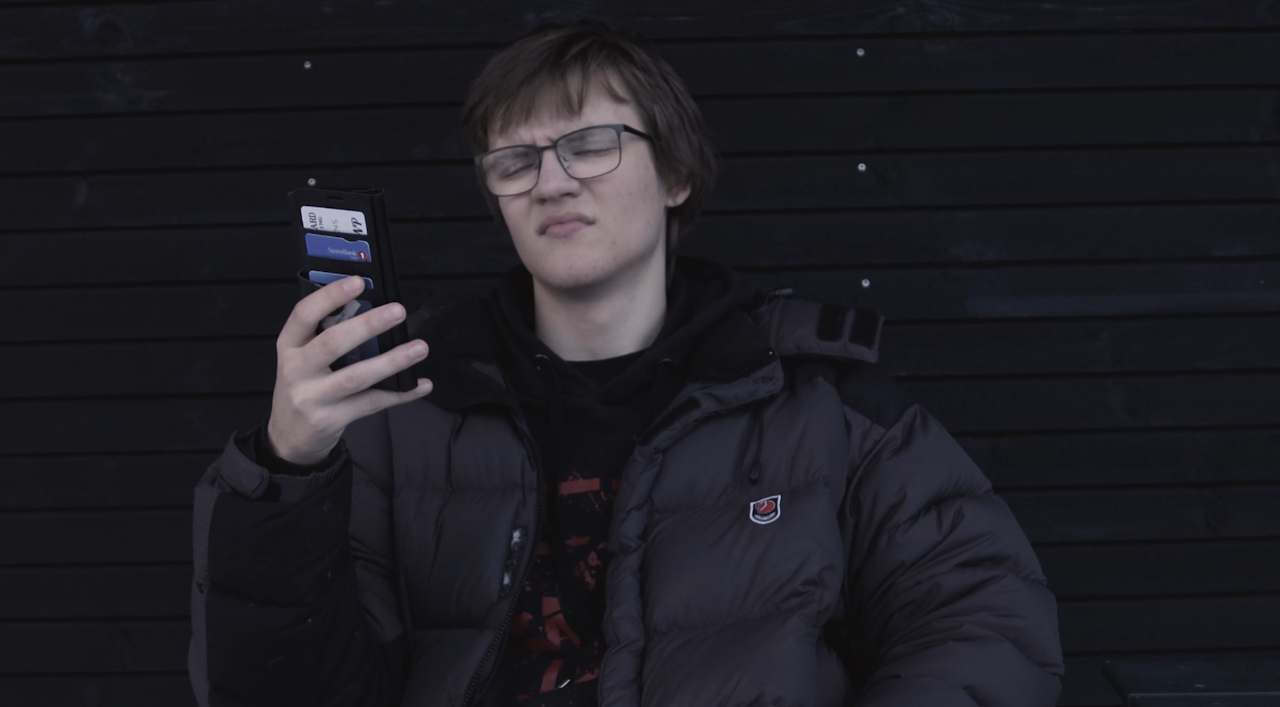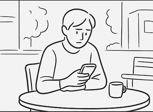 En person sitter med en kopp kaffe og scroller på mobilen. Kameraet fokuserer på skjermen – nyheter, meldinger, stress. Personen sukker. Personen legger mobilen fra seg, tar et langt pust, ser seg rundt og smiler. De legger så mobilen i lomma, ser opp og går videre med ro. Personen skal være til stedet og ikke fokusere på mobilen og dårlige nyheter.